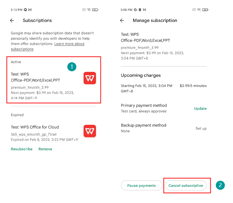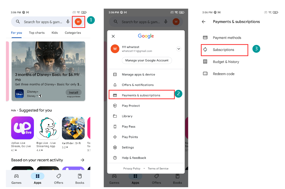1. If you purchase an auto-renewal subscription on Google Play, you can cancel the subscription on the Google Play store. To cancel the subscription, perform the following steps:
